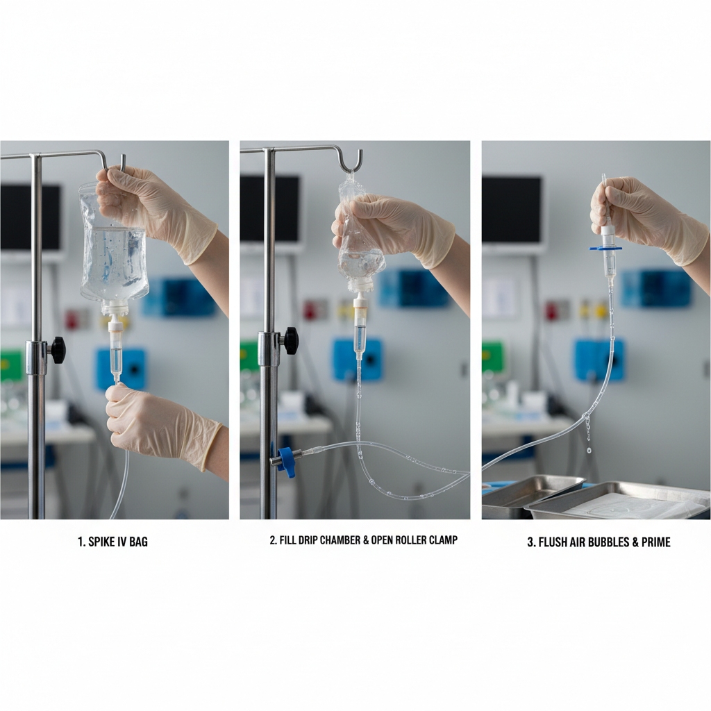 Wash hands 20 seconds with soap; dry well. Don gloves. Unwrap set aseptically—don’t touch sterile parts. Wipe bag port with alcohol, let dry. Sterility safeguards block 99% of bugs—your foundation for safe flow, emphasizing hand hygiene and infection prevention.