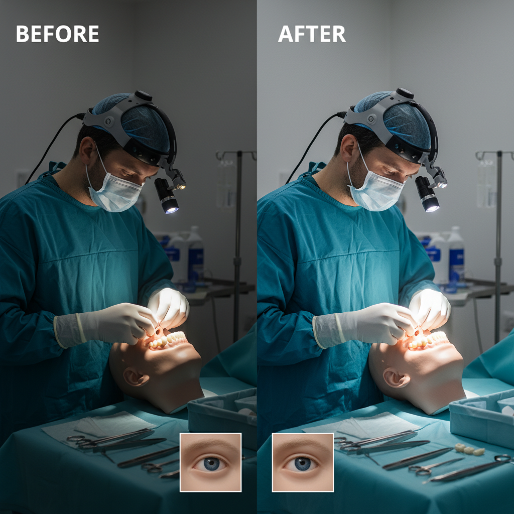In deep cavity surgery, such as an ENT sinus procedure or a root canal, overhead lights are practically useless. Your head, hands, and instruments inevitably cast shadows that block your view. Coaxial LED headlamps project light along the exact same path as your vision. This means that if you can see into a cavity, the light is already there. This shadow elimination is vital for avoiding errors and speeding up workflow optimization.